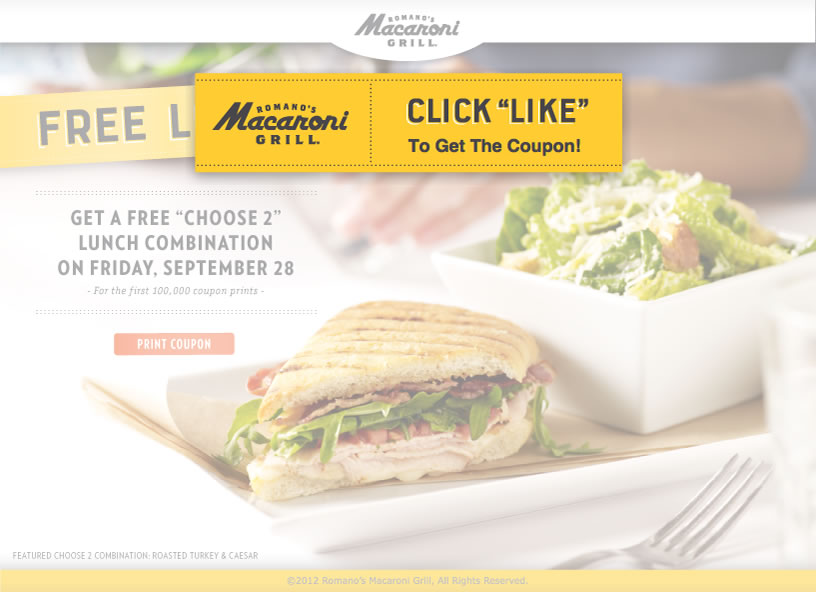 If you go to Romano’s Macaroni Grill this Friday, and click “Like” them on their Facebook page, you will get a coupon for one Free “Choose 2″ lunch combination! Valid on 9/28 from 11am-4pm. Print it and go!